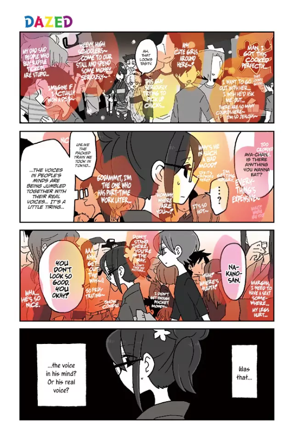 For instance, when Aya-chan goes to a festival with her friends and finds herself lost in the crowds, her power causes her to be overwhelmed by the sheer amount of thoughts that she’s picking up from people. The colored speech bubbles literally sit on top of her own thoughts and visually drown out her own self on the page.