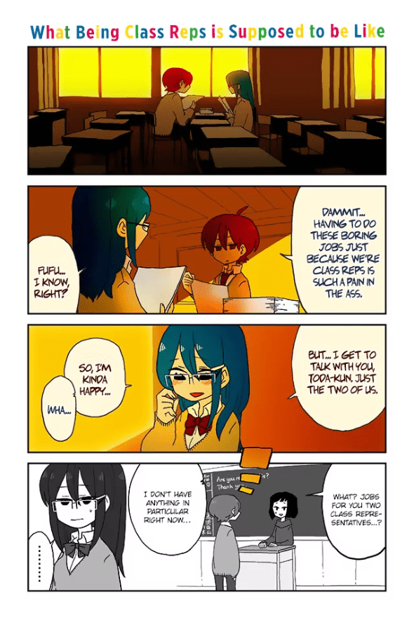 Okay, first things first, I absolutely have to talk about the main visual idea of this manga. The author’s use of color to identify the real world from the mental one is just amazing. It reminds me of the use Technicolor in The Wizard of Oz to denote the difference between the “real” world of Kansas from the magical world of Oz. However, the way that it’s used in the manga is so freaking clever. Initially, the mental images and thoughts are overlayed on top of what is actually happening in the 4-koma (and in a lot of unique and diverse ways even when doing the same joke). However, as the story continues, the mangaka begins to blend the two together in various ways that I enjoyed immensely.