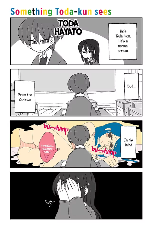 There is also a section in which (mild spoiler) Aya-chan starts to believe that maybe her ability to read minds is actually just a grand delusion, which would mean her only confidant in the series that knows about it may also have been made up by her delusional state. This existential crisis is shown visually with suddenly everything on the page being colored except Aya herself, showing her internal struggle of now believing her whole world to be a lie, with almost nothing black and white on the panel to cling onto as real.