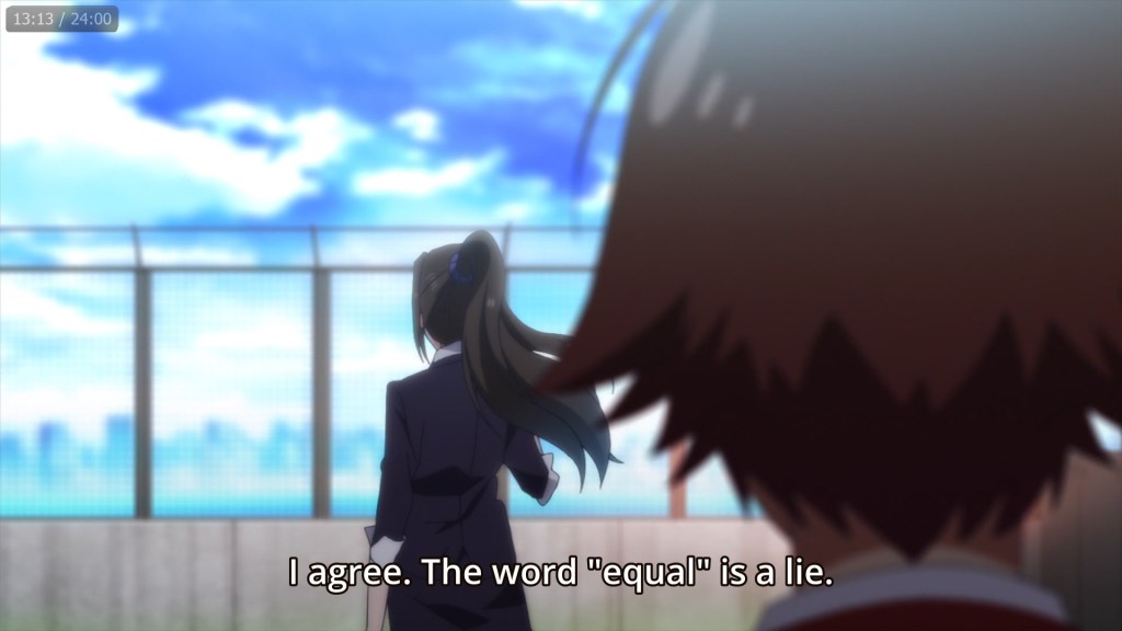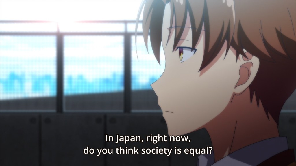 Classroom of the Elite paints these sorts of pictures from the beginning of volume one, making allusions to many real life inequalities and big philosophical questions towards the reader intending to showcase how real life’s systems are inherently unfair and flawed to those less privileged. With our point of view set through our main character, Ayanokouji Kiyotaka, who takes a very neutral approach towards anything that causes him problems or trouble, it’s an excellent way to give the reader some room in which to work out these mentally philosophical problems of inequality that present themselves throughout the first volume (something that was heavily presented in the anime as well).